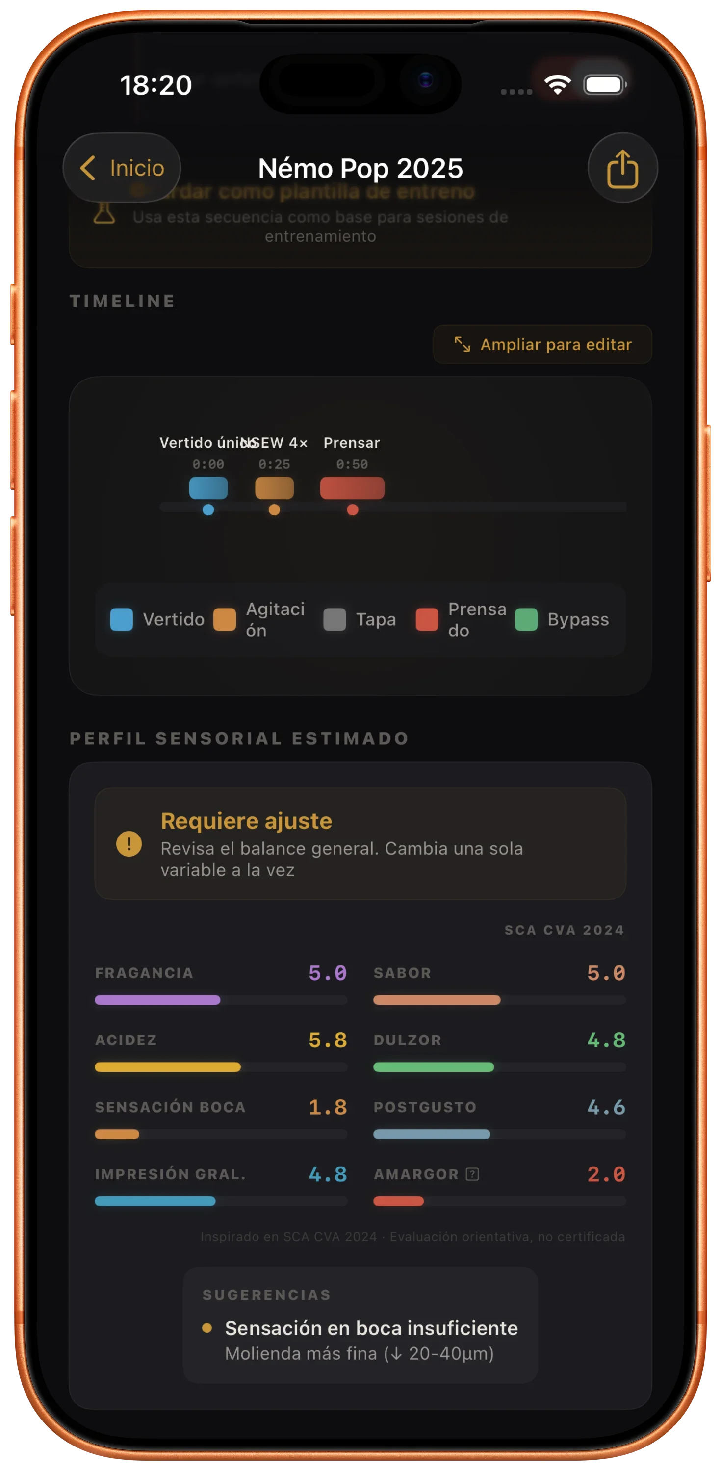 La app de referencia para preparación AeroPress y competición WAC. Timer de precisión, banco de recetas, perfil de agua y molinillos profesionales.